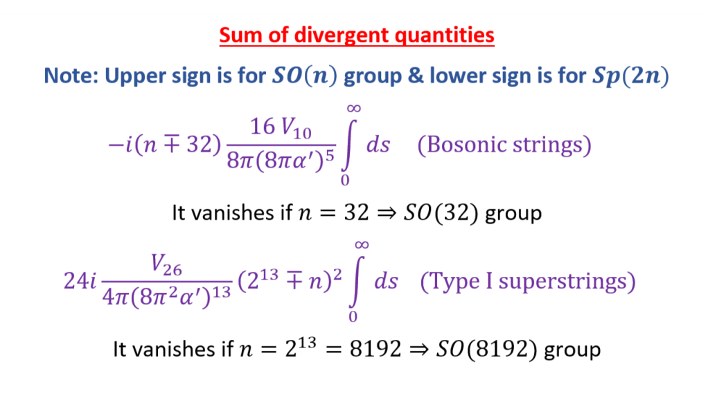 When we add up all the divergences due to these three worldsheets, we see that the symplectic group can’t be the gauge group because if it is the gauge group, the divergences never cancel. Moreover, we also deduce that the only gauge group possible is SO(8192) in bosonic string theory and SO(32) in superstring theory.