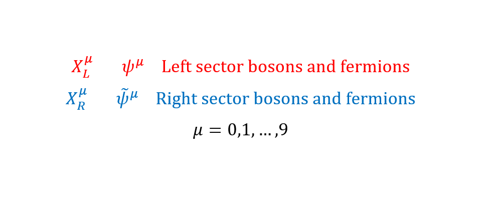 We can also choose half (i.e. 16) of the left fermions to be in the same sector and the other half (i.e. 16 again) to be in the same sector. So, there are four sectors in this theory. NS-NS, NS-R, R-NS, and R-R. We again investigate the massless excitations of this theory but only due to these left fermions.