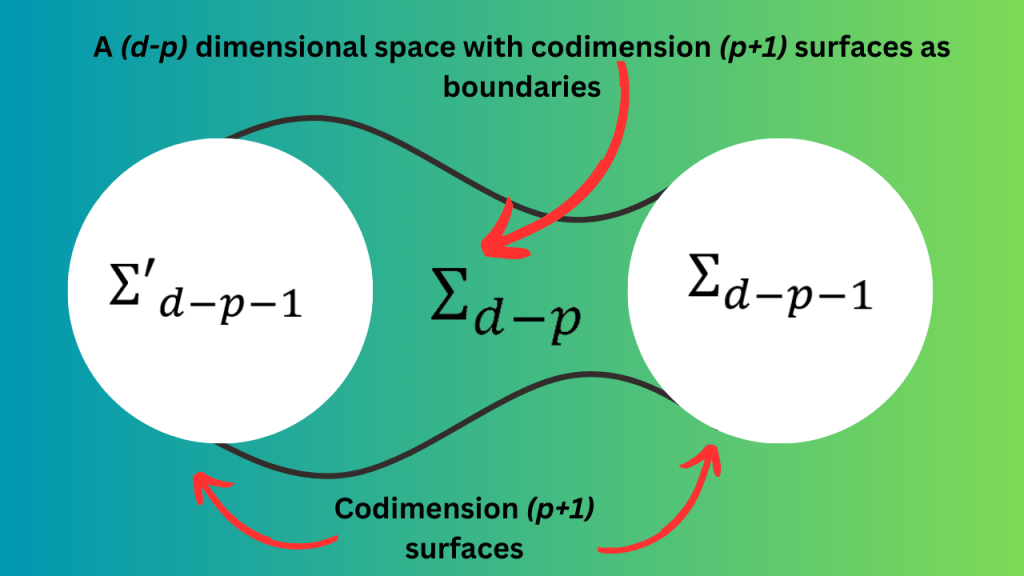 The symmetries that we talked about earlier are called 0-form symmetries. Their topological operators are associated with codimension 1 surfaces. The generalization of this scenario is to have p-form symmetries whose topological operators are associated with codimension (p+1) surfaces (their dimension is d-p-1). We can talk about (d-p) dimensional spaces that have these surfaces as boundaries.