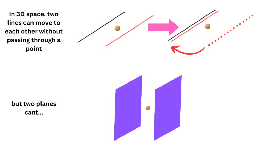 As an analogy, take two lines in 3D space and we can see that we can make one line meet the other without going through a point between them. If we had two planes in 3D space, then going through a point between them is inevitable.