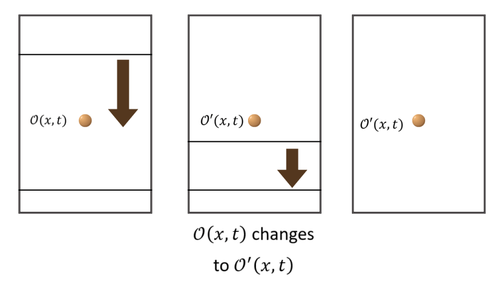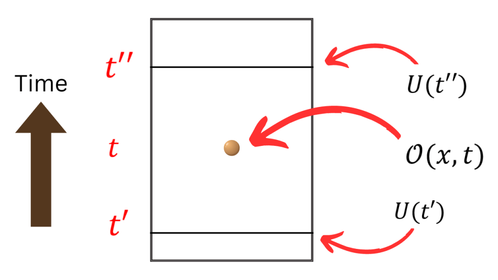 Let’s recast the story of the action of the unitary operator on the local operator in another way. Let the local operator be some time t and take two unitary operators at times t’ and t” such that t is between t’ and t”.