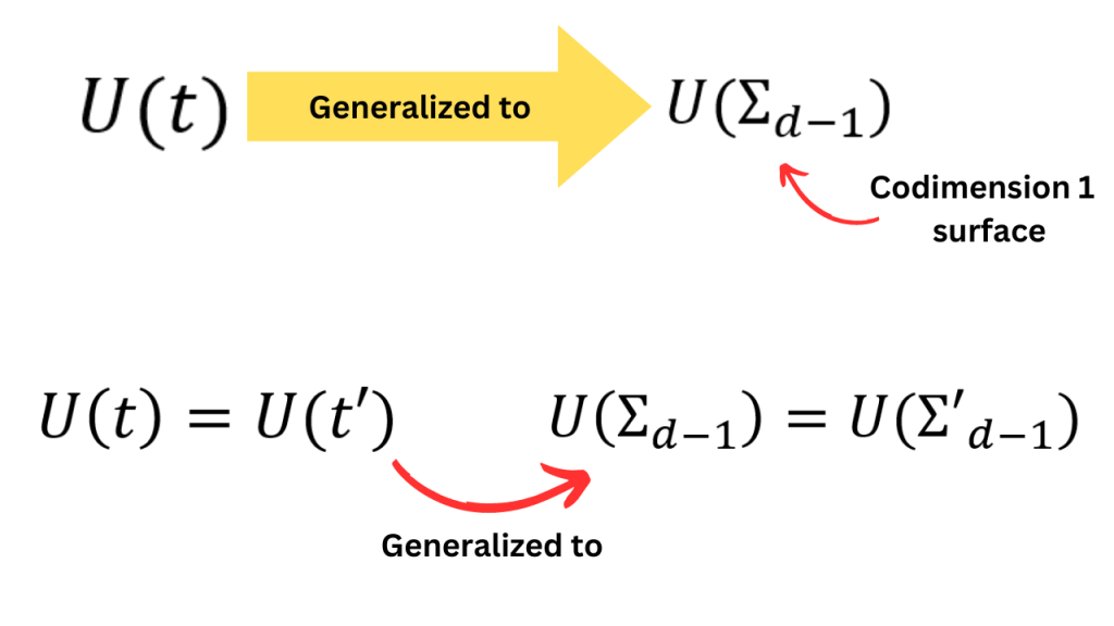 In the previous scenario, we associated a unitary operator with a time slice. If the dimension of spacetime is d, then the dimension of a time slice is d-1. Such a surface is called a codimension 1 surface (i.e. a surface of 1 dimension less than the total space). A surface of d-m dimensions will be called a codimension m surface.