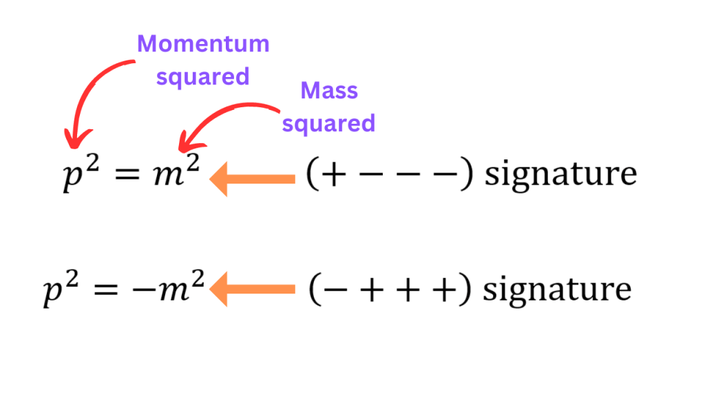 The (+ – – -) convention gives a nice looking relation, specially when one writes down the propagator of a scalar field (because it easily shows the location of poles in the momentum space).