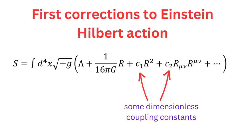 Now, if we want to add corrections to this action, the next logical step is to include terms with operators of dimension [Energy]4 which means that the coupling constants will be dimensionless. We saw before that the Ricci scalar has a dimension of [Energy]2 and this is true for Riemann tensor and Ricci tensor as well (because these quantities too have terms with either a double derivative or a product of two derivatives).