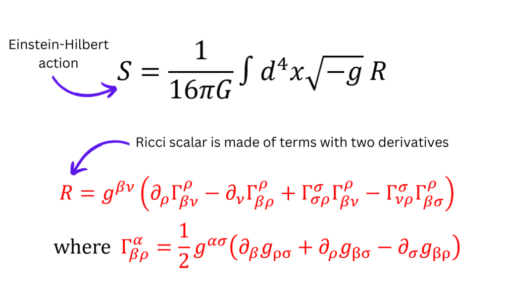To make the Einstein Hilbert action (the action that describes pure gravity), we need some scalar made out of the quantities that describe the curvature. One such scalar is the Ricci scalar. However, Ricci scalar is made out of terms that have a double derivatuve or a product of two derivatives. These terms have a dimension of [Length]-2 which is [Energy]2 and thus, the required dimension of [Energy]4 isn’t acheived by Ricci scalar alone. In order to achieve this dimension, we divide the Ricci scalar by a quantity that has dimensions of [Energy]-2. This quantity is nothing but the Newton’s constant G. So, the Einstein Hilbert action is shown in the diagram below.
