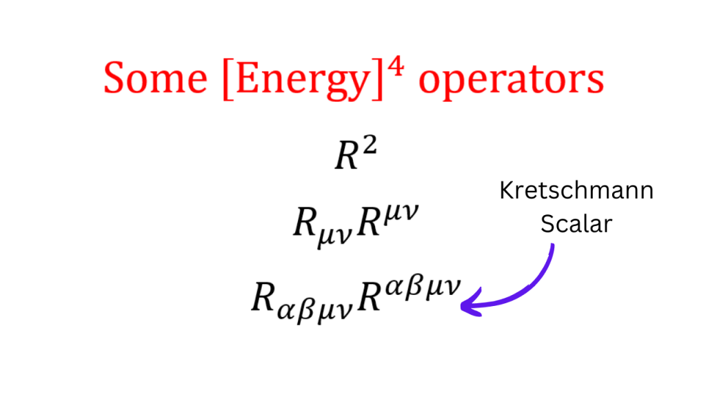 Now, we need to figure out the operators made out of the Riemann tensor that have dimension [Energy]4. To do this, we can multiply Ricci scalar with itself, Ricci tensor with itself (with all indices contracted, so that the resulting operator is a Lorentz scalar) or Riemann tensor with itself (with all indices contracted). This last operator is called the Kretschmann scalar.