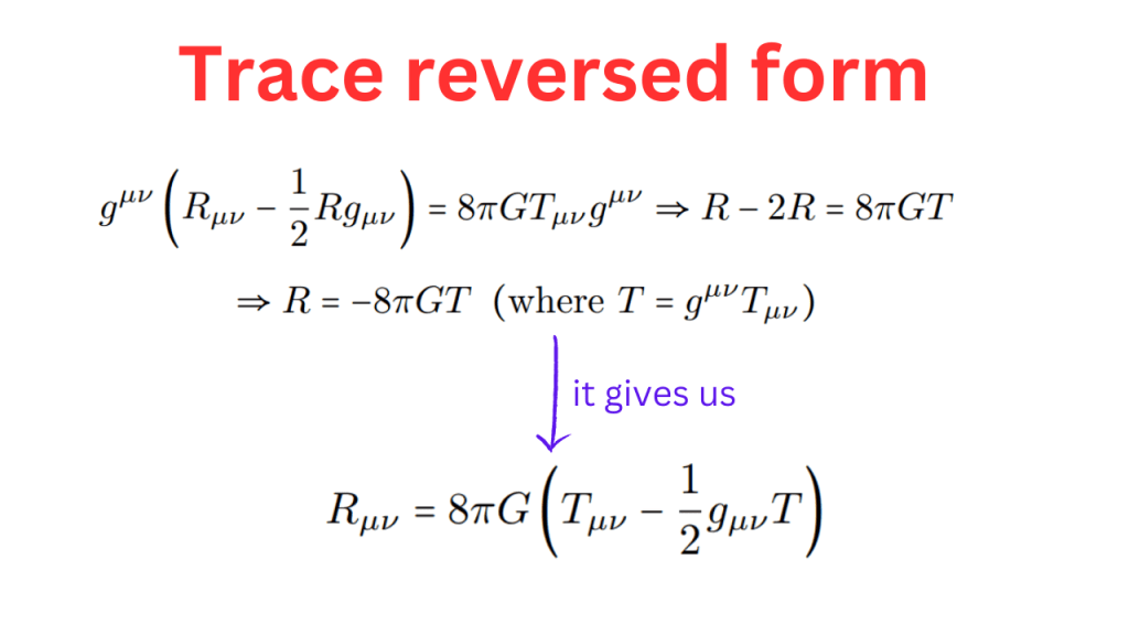 We start with the Einstein field equation (EFE) and convert it to a form that is used to solve this equation. This form is called the trace reversed form and to derive it, we contract EFE with the metric tensor.