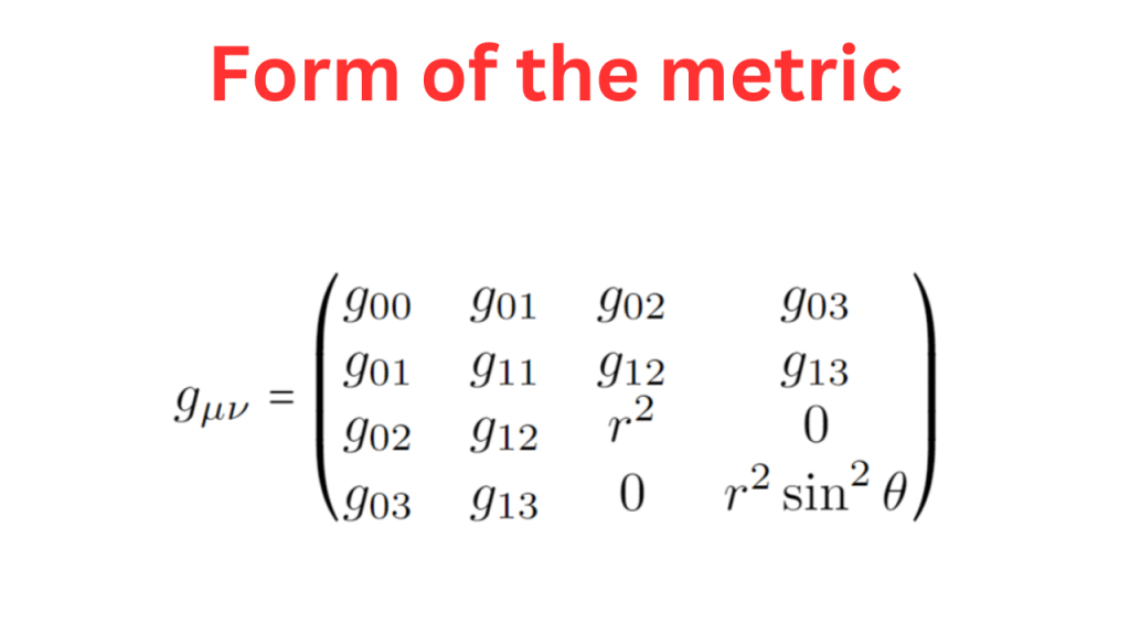 Now, since the metric is spherically symmetric, the metric tensor in the (t,r,θ,ϕ) coordinates (which we will also refer to as (x0,x1,x2,x3)) should have the form shown in the picture below (I am taking ϕ as the azimuthal angle).