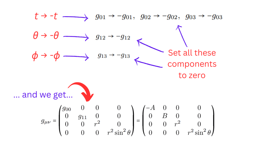 We have used the fact that the metric tensor is symmetric. Since the metric tensor is independent of time, no component depends on t. In addition, since the metric has rotational symmetry about the z axis (it is a consequence of the spherical symmetry), no component should depend on ϕ as well. This means that under the transformations t → -t and ϕ → -ϕ, the metric tensor should be invariant. In addition, due to spherical symmetry, the metric should be invariant under the transformation θ → -θ as well.