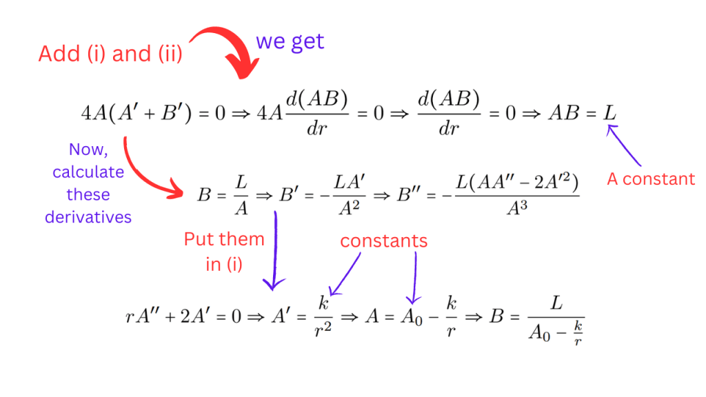 Let’s call the three boxed equations as (i), (ii) and (iii). If we add (i) and (ii), we get the conclusion that the product of A and B is a constant. If we put this result in (i), we will get some expressions for A and B. This process is shown in the picture below.
