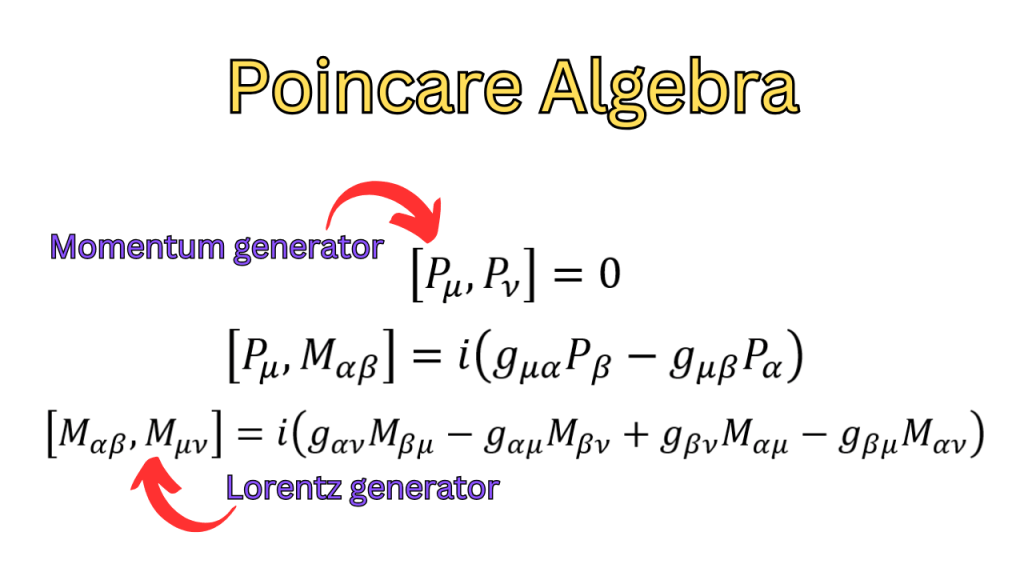 In usual relativistic QFTs have some spacetime symmetries. These symmetries are rotations (one about every space direction), boosts (one along every space direction) and translations (one along every spacetime direction). The set of all rotations and boosts make the collectively make the Lorentz group and if we add translations to the mix, we have the Poincare group. Please note that boosts can be seen as rotations as well. These rotations mix a space direction with a time direction. Therefore in the future, when I write “rotations”, I mean rotations and boosts. We have generators for all the independent transformations in the Poincare group and their commutators form the Poincare algebra.
