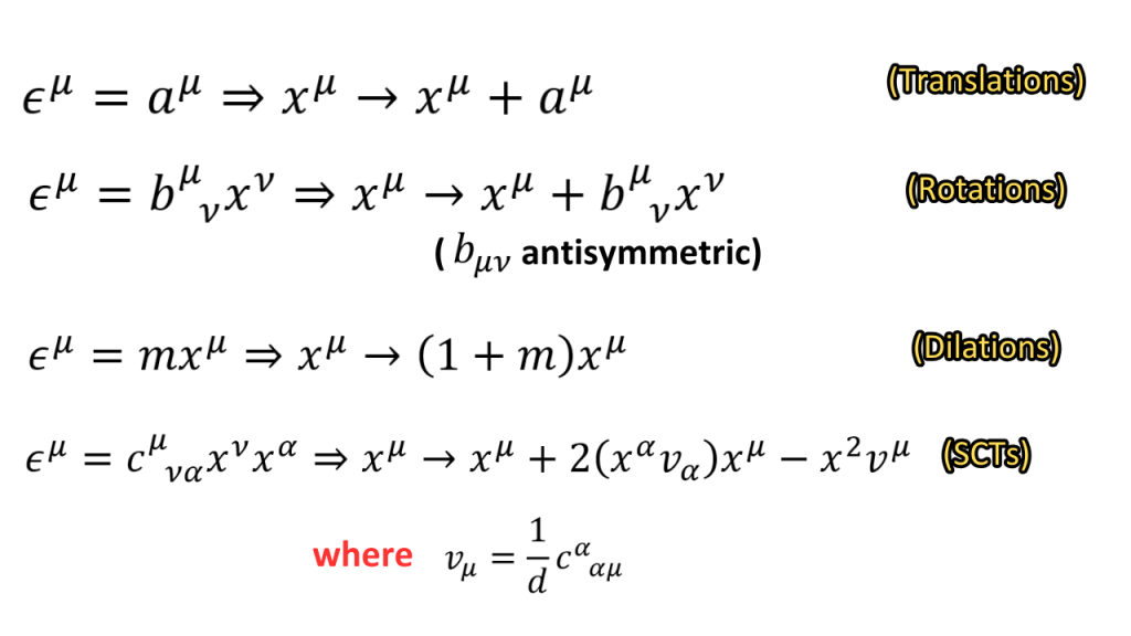 Therefore, we see that the conformal group contains the Poincare group. Just like the Poincare group, the generators of the Conformal group give us the conformal algebra (to be continued).